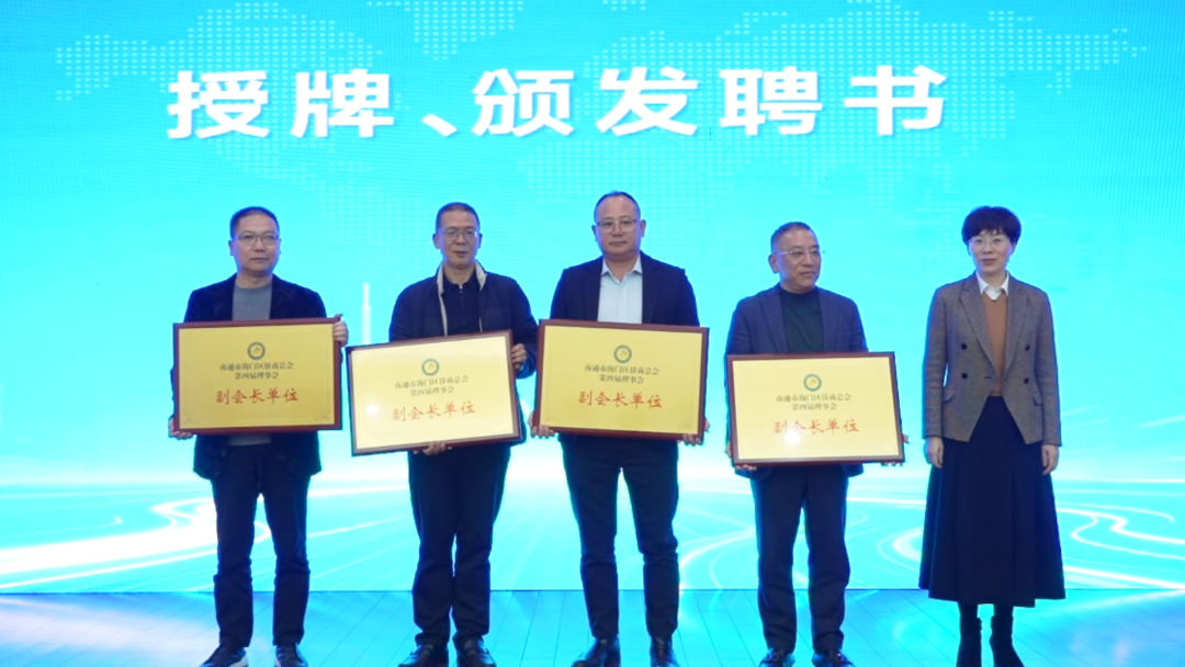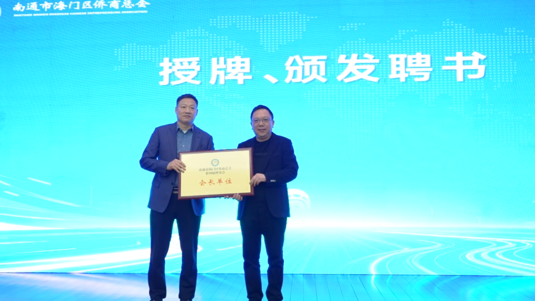 会上,金志伟,杨春红,邓宏林,市委统战部五处处长、一级主任科员胡晓丽等为会长、副会长、监事、秘书长等单位、个人授牌并颁发聘书。崇川区侨商会会长、江苏林格自动化科技有限公司总经理顾彬代表兄弟商会致贺词。海门区侨商总会与海门农商行签订了金融服务合作协议。